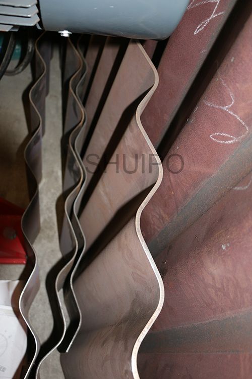波紋板成型機主要分為機架、驅動部分、上壓輪、下壓輪、進料導向機構、以及前后工作臺,波紋板成型機是通過同時旋轉的上、下壓輪,將平板加工成波紋狀,成型效果一致性好,效率高,波紋的高度調整有電機驅動,通過操作控制箱上的按鈕調整波紋高度范圍,調整方便,性能可靠。